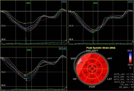 Εκτιμάται με τη χρήση αλγορίθμων η μεταβολή του μήκους του καρδιακού μυός κατά τη συστολή και τη διαστολή, επιτρέποντας την αναγνώριση μικρών μεταβολών στην καρδιακή λειτουργία και συνεπώς την πρωιμότερη διάγνωση. Είναι η εξέταση εκλογής για την παρακολούθηση της καρδιακής λειτουργίας ασθενών που υποβάλλονται σε χημειοθεραπεία ή σε ακτινοβολία στον θώρακα.